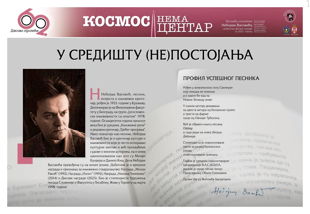 Десет живописних плаката пратили су изложбу Космос нема центар. Назив водећег паноа јесте У средишту (не)постојања који доноси кратку биографију песника и књижевног критичара Небојше Васовића. За њим ређа се и осталих девет сегмената који чине пропратни материјал физичке изложбе – Песничка галаксија Небојше Васовића, Поетске координате Небојше Васовића, Гравитација стиха, Лирске орбите, Скице свемира, Стихови за сваки дан и свечане прилике: Зенаиде, ритички и полемички текстови Небојше Васовића, Поезија између сна и ироније: Дис и Васовић, Критичари и писци о Небојши Васовићу.
